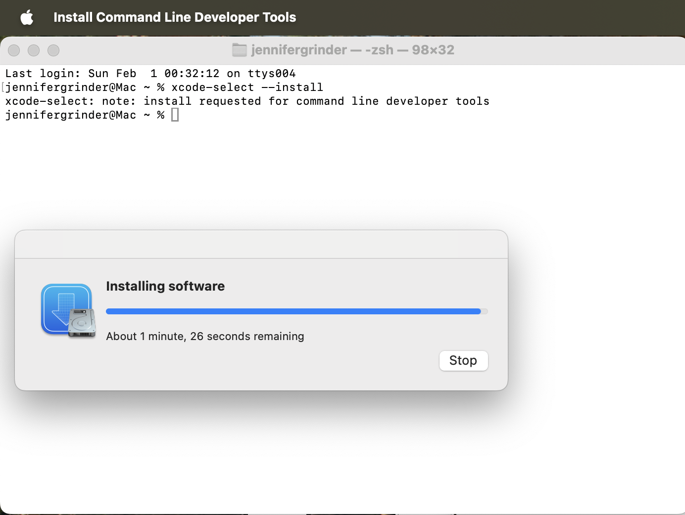 Since these command line developer tools contain both Git, and also the equivalent of Rtools for Windows, we will need to install them for this course. To get started, first open your terminal.