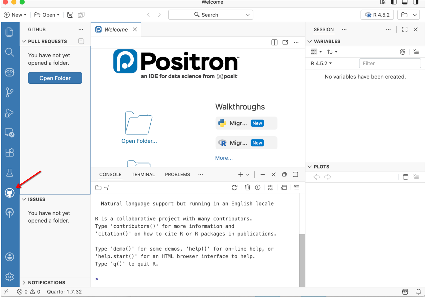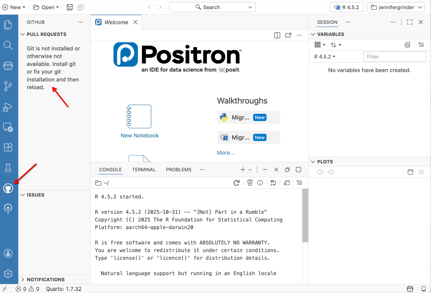 Now that you have all the software installed, we need to make sure that everything is communicating properly with each other. To do this, we will start by making sure your GitHub account and Positron are connected.