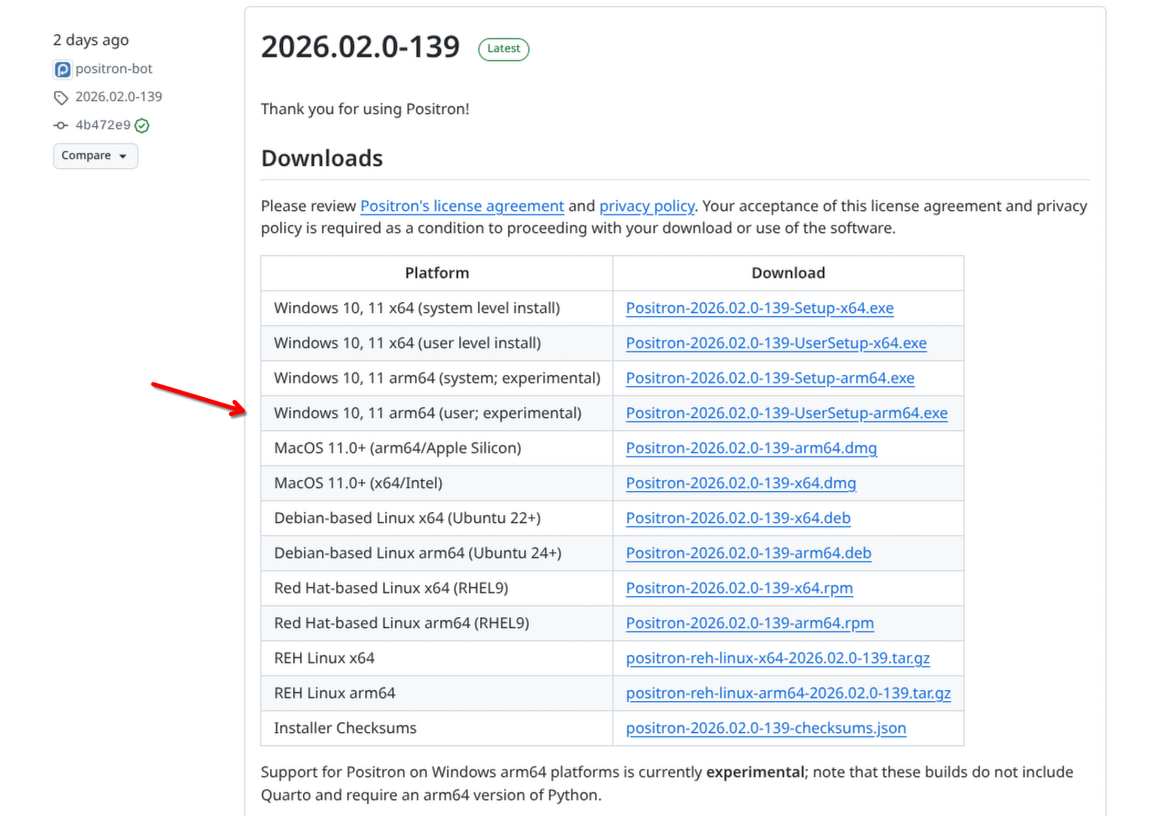 Please note, if you are using a Windows computer with an ARM based chip (like is the case with Snapdragons), you will need to download the installed from the Positron’s GitHub Release Page, as they are still testing some features.