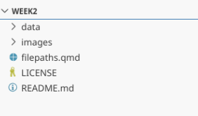 After this detour into variables and indexing, let’s return our focus to how to use these in context of file paths. Working from within our Week2 project folder, let’s see what directories (folders) are present