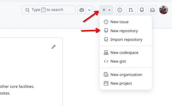 First off, login to your GitHub account. Once there, you will select the options to create a new repository (similar to what you did during Using GitHub)