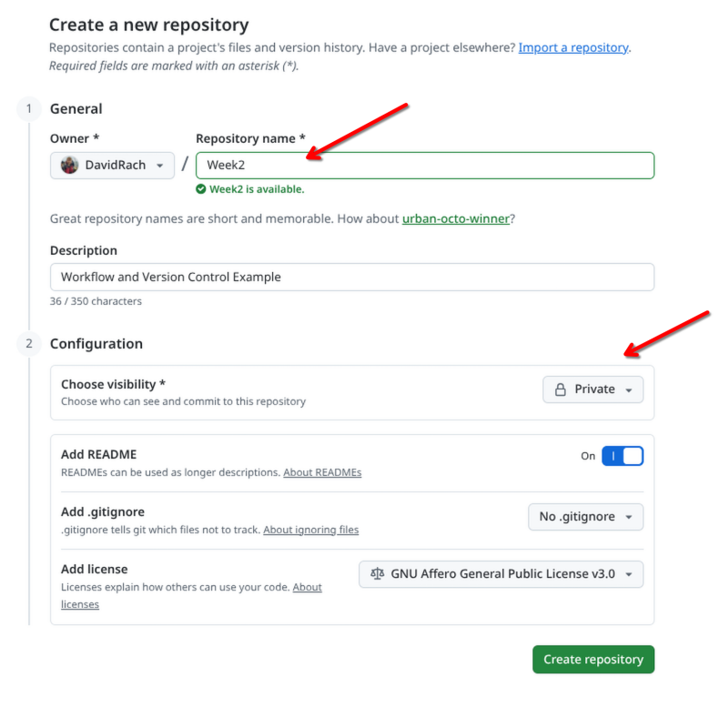 For this week, let’s set this new repository up as a private repository, and call it Week2. This will keep things consistent with the file.paths we will be showing in the examples.