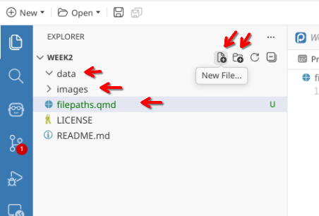 Your new repository will then be imported from GitHub. Once this is done, create two subfolders (data and images) and a new .qmd file (naming it filepaths.qmd).