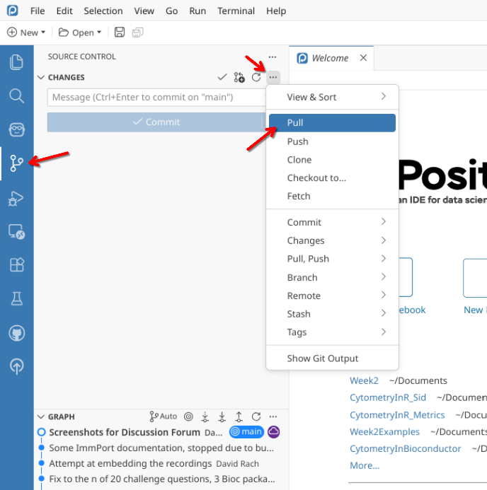 Once CytometryInR project folder has opened, you will need to pull in the new data from GitHub to your local computer.