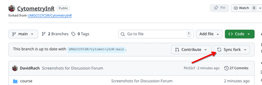 With this done, return to GitHub and open your forked version of the CytometryInR course folder. If you haven’t yet done so, click on sync to bring in this week’s code and datasets.