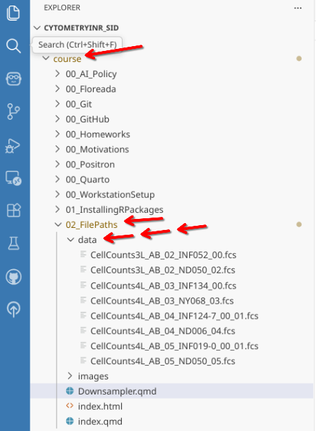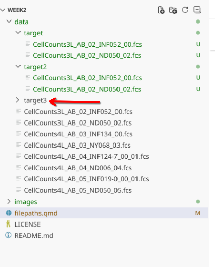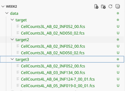 Once this is done, you will see within the course folder, containing this weeks folder (02_FilePaths). Within it there is a data folder with .fcs files. To avoid causing conflicts when bringing in next week’s materials, you will want to manually copy over these .fcs files (via your File Explorer) to the data folder within your “Week2” Project Folder.