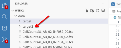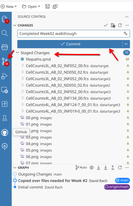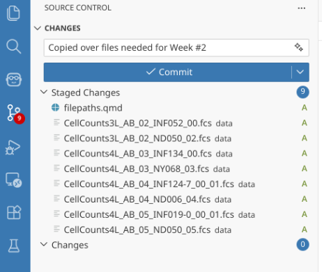 When you reopen your Week2 project folder in Positron, you should now be able to see the .fcs files within the data folder. Next, from the action bar on the far left, select the Source Control tab. Stage all the changes (as was done in Using Git), and write a short commit message.