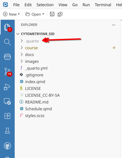 Within Positron, in addition to visible folders, we also have hidden folders (denoted by the “.” in front of the folder name when using list.dirs()). In the case of one of our course website folders, we can see a “.quarto” folder shown in a lighter gray . The “.git” folder we saw from list.dirs() is typically hidden when viewing from Positron.