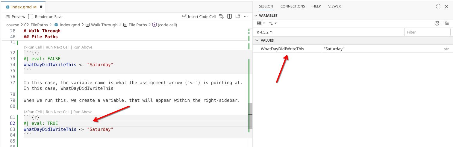 WhatDayDidIWriteThis <- "Saturday"In this case, the variable name is what the assignment arrow (“<-”) is pointing at. In this case, WhatDayDidIWriteThis