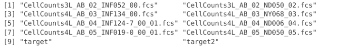 As you can see, we are getting back both folders and individual .fcs files. We could consequently change the pattern to provide a character string that will only return the .fcs files. We will go ahead and assign this list to a variable named files, for later retrieval.