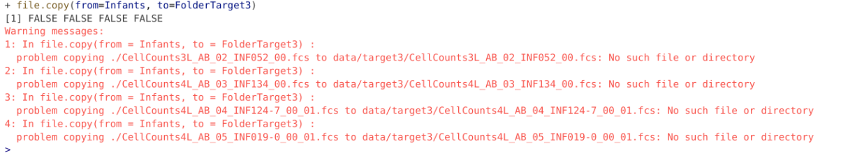 To copy files to another folder location, we use the file.copy() function. It has two arguments that we will be working with, from being the .fcs files, and to being the folder location we wish to transfer them to. If we tried using them as we currently have them: