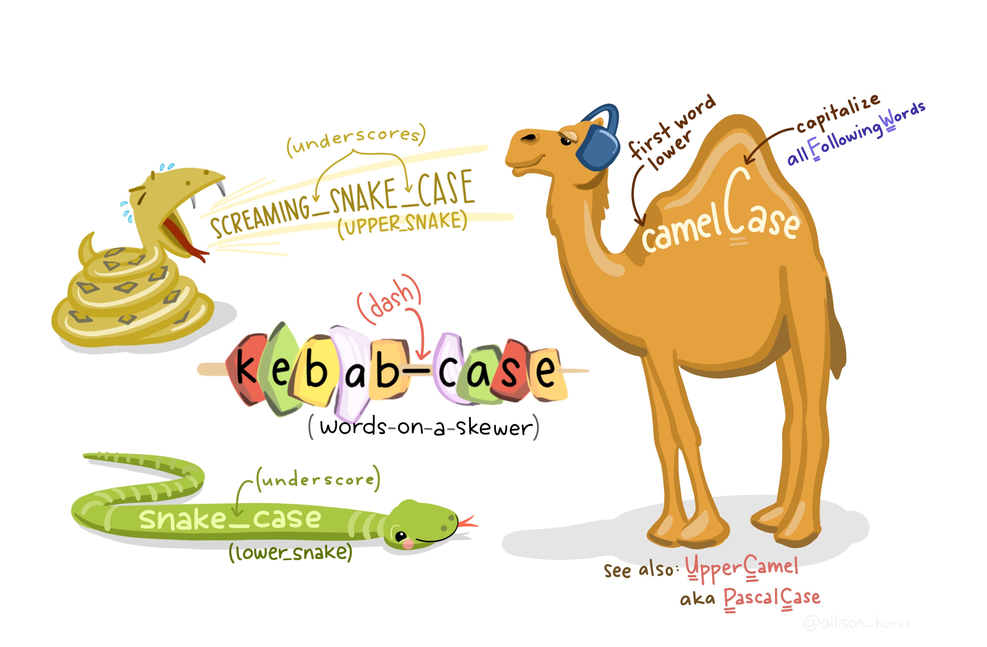 Top_Secret_Meeting_Day <- "Saturday"The above (with individual words separated by _) is collectively known as snake case. The alternate way to help delineate variable names is “camelCase”, with first letter of each word being capitalized (seen in the previous example).