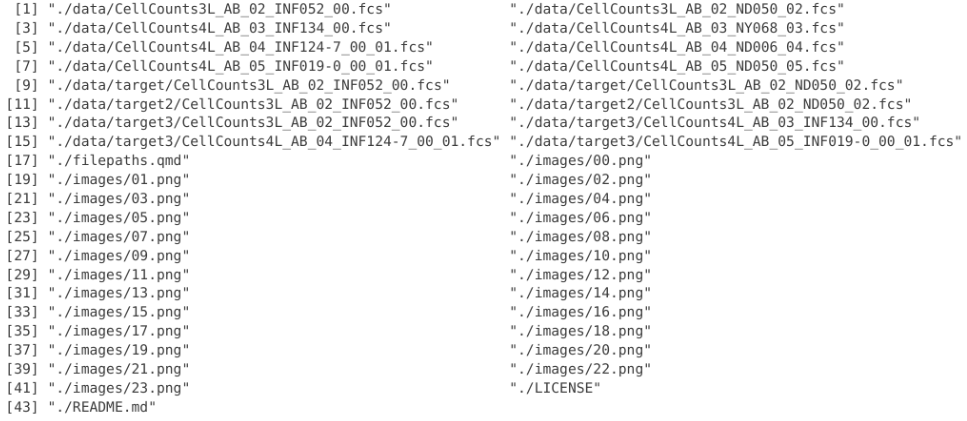 This will prove valuable in the next several weeks when working with .fcs files, as the majority of functions we will use for Bioconductor project R packages need file.paths to locate both .fcs files as well as .csv files that contain metadata.