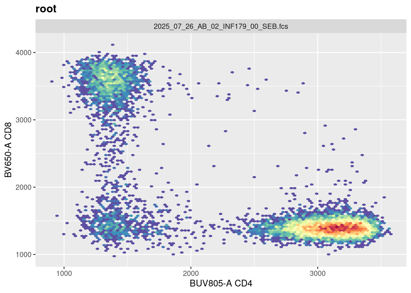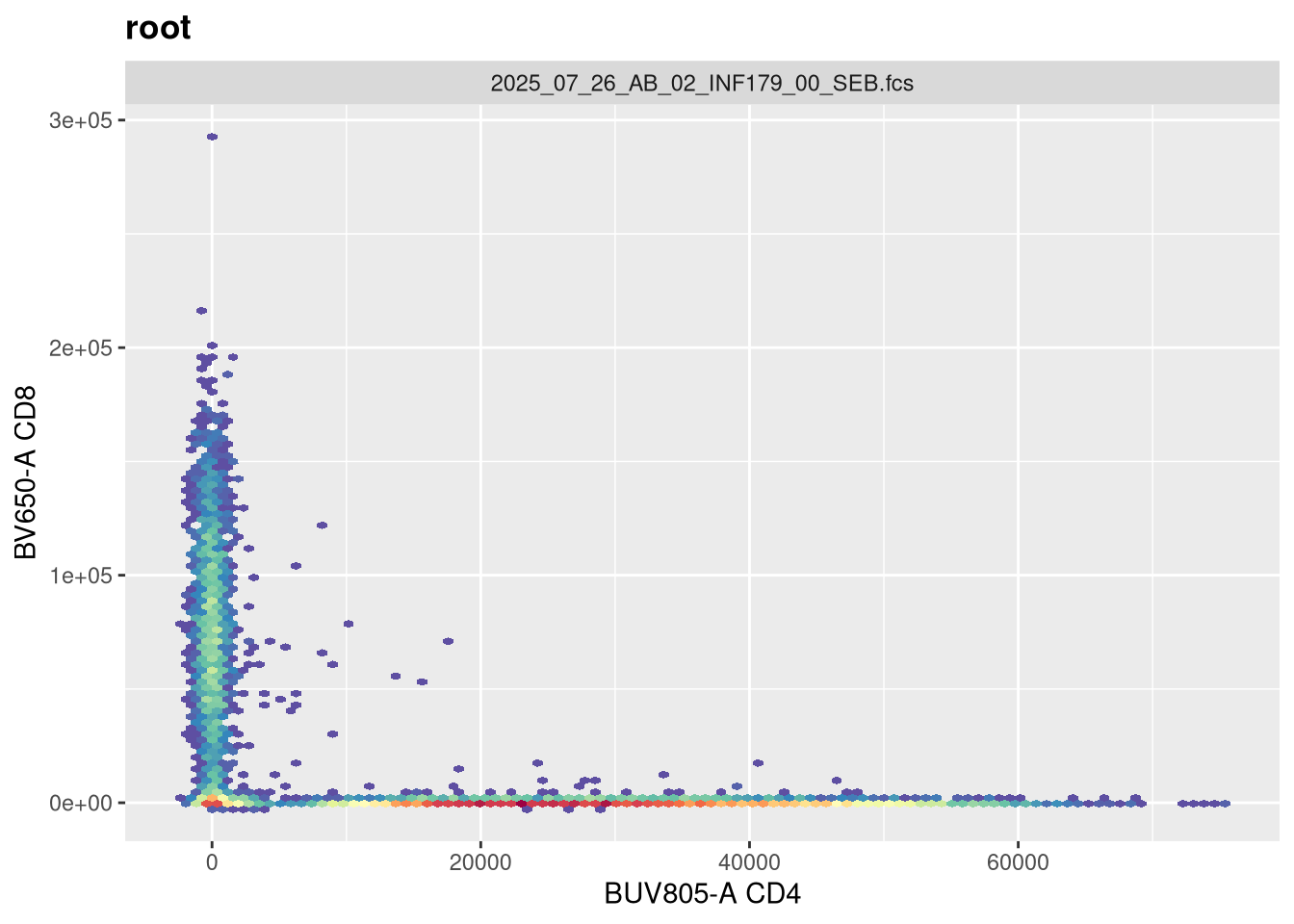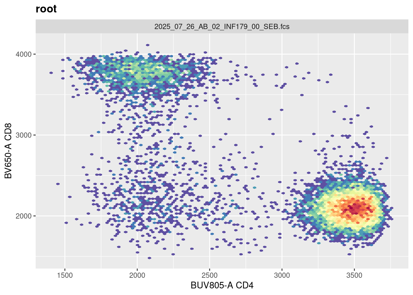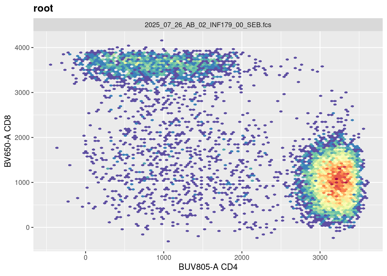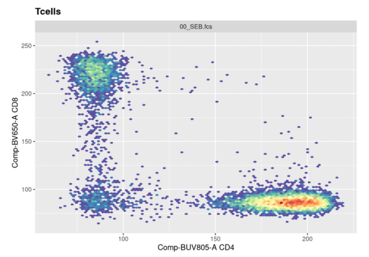 As we can see, the scale currently appears linear, with a wide stretch of positive values for both CD4 and CD8 T cells. By contrast, you may remember the transformed version brought for this same .fcs file brought in from FlowJo via CytoML resembled the following