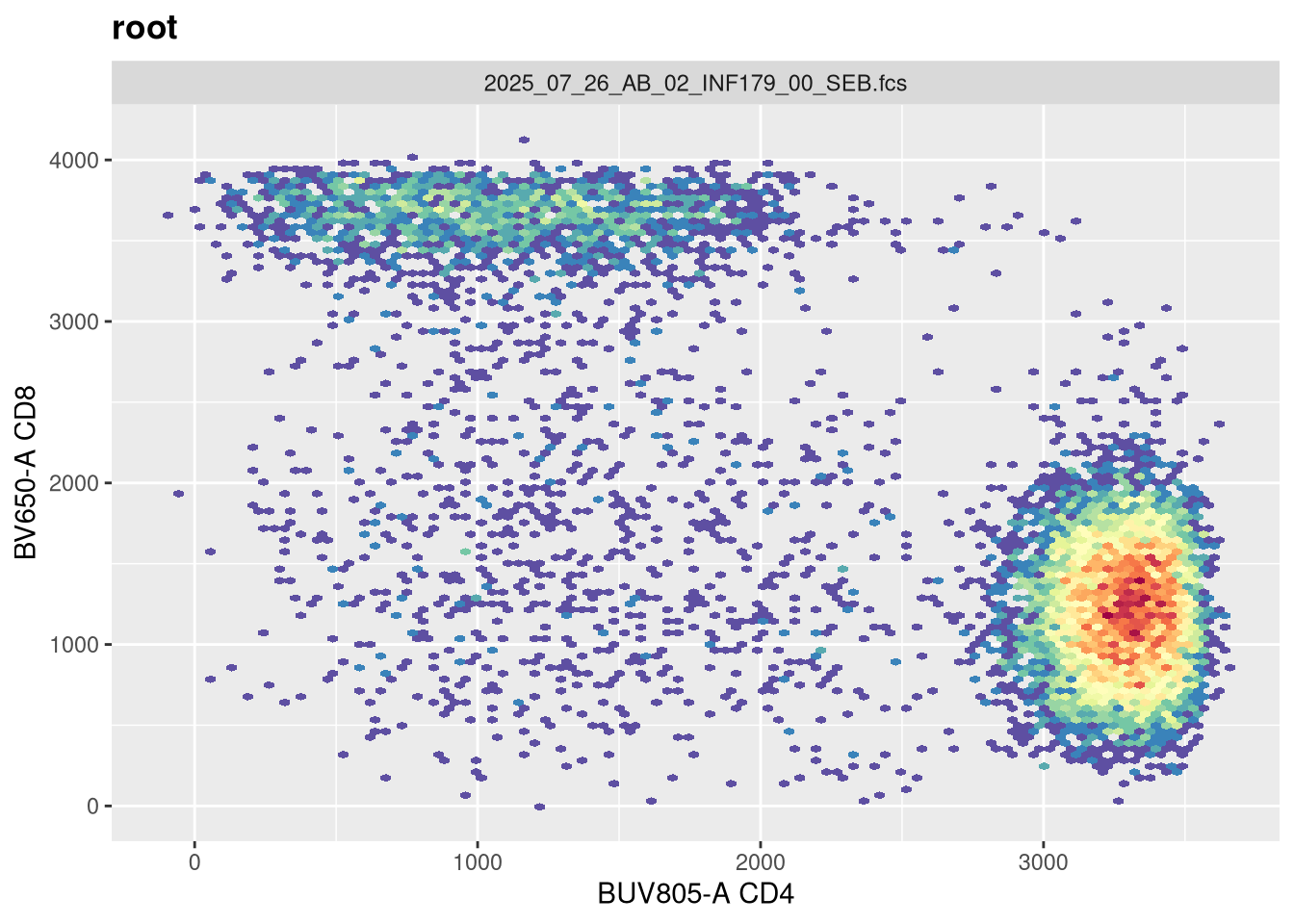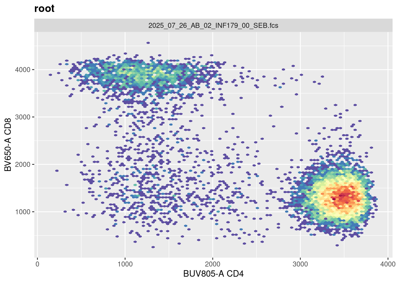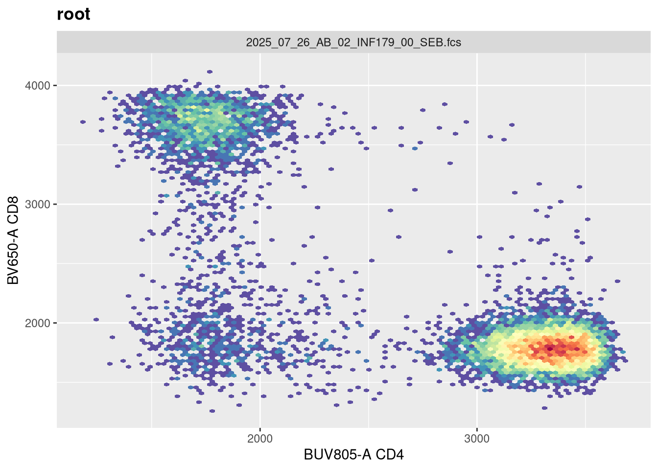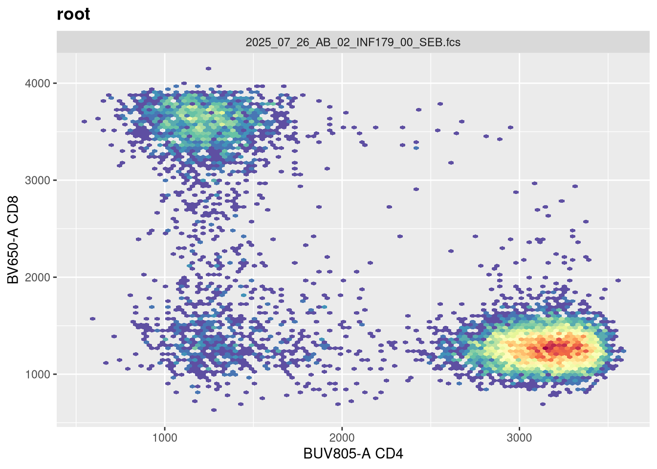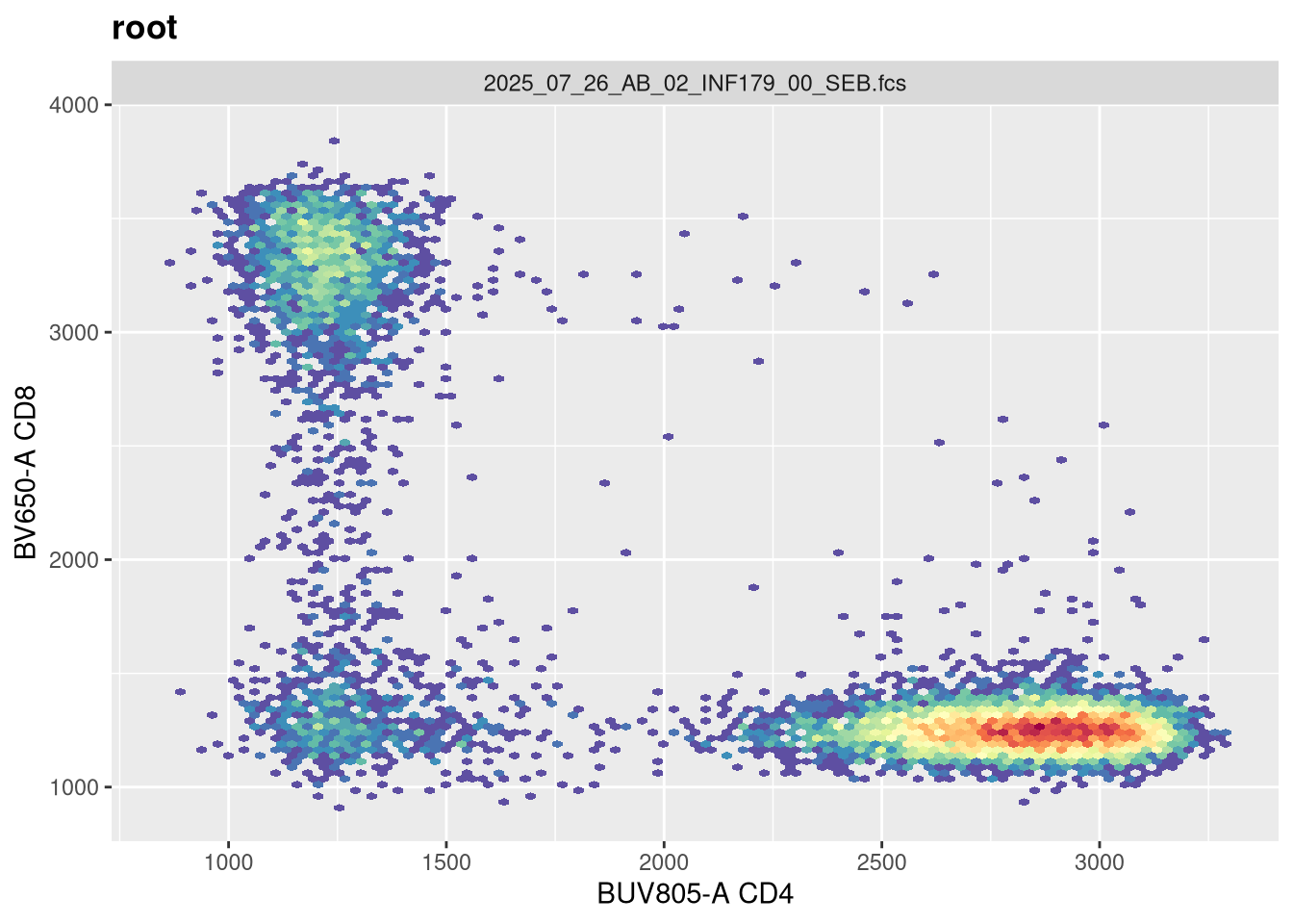 As we can see, the scale currently appears linear, with a wide stretch of positive values for both CD4 and CD8 T cells. By contrast, you may remember the transformed version brought for this same .fcs file brought in from FlowJo via CytoML resembled the following