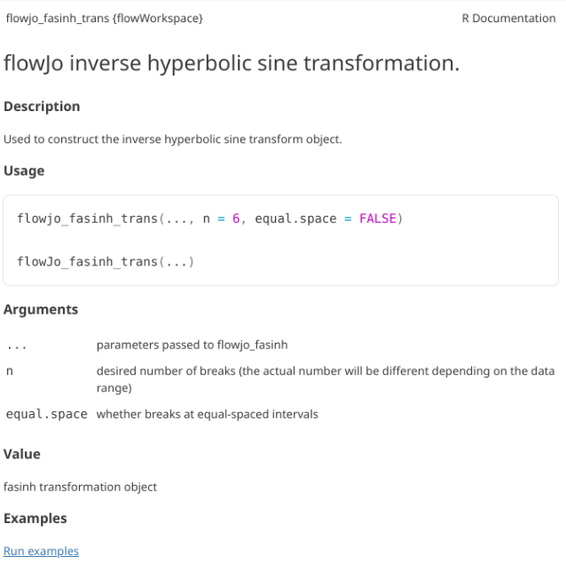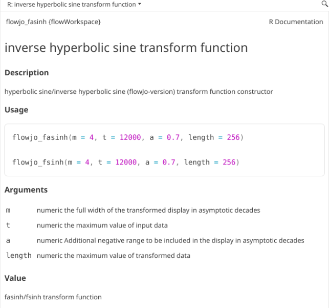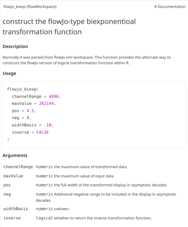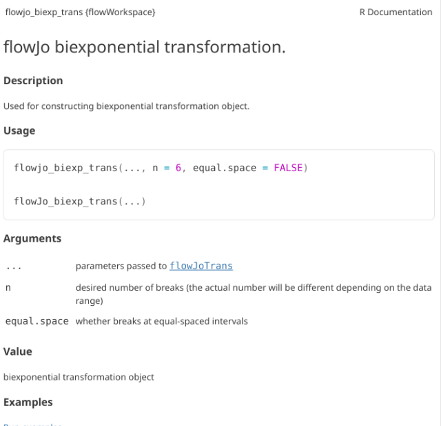 In this case, the help documentation doesn’t provide much immediately. Part of this is that flowjo_biexp_trans() appears to be a wrapper function, which passes arguments on to the flowJoTrans() function. If we look this one up