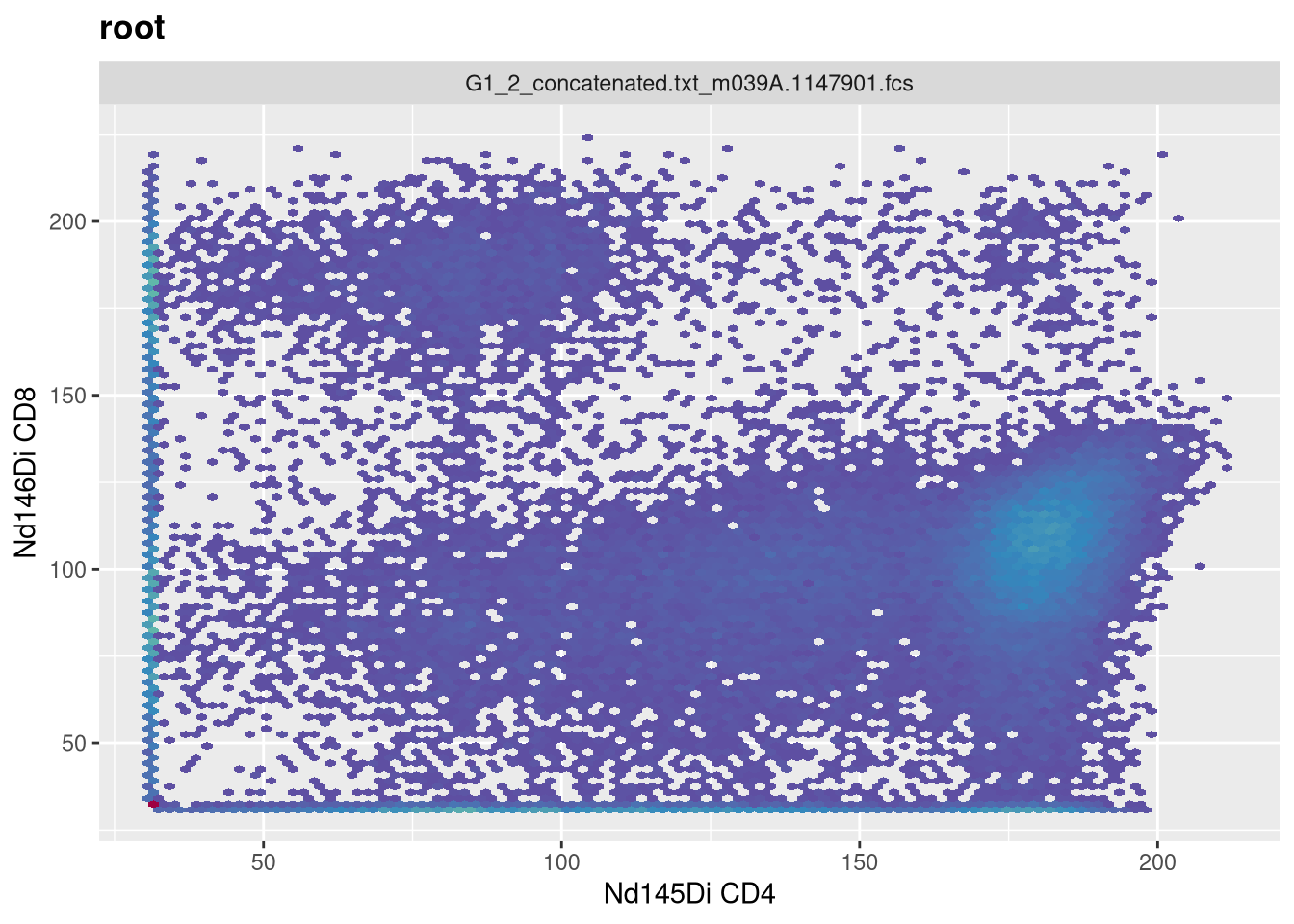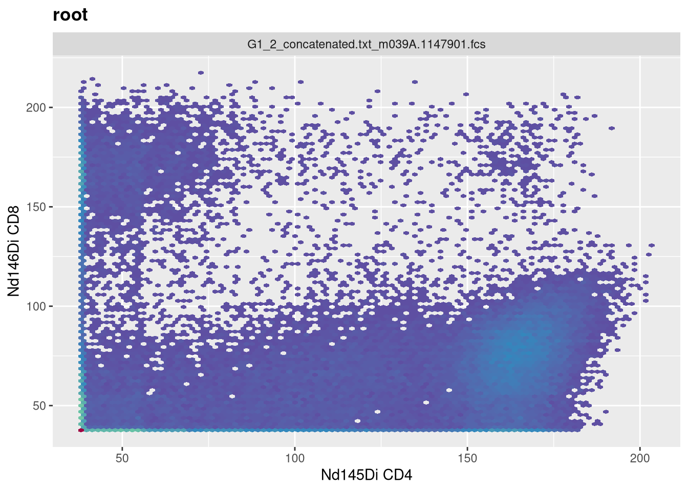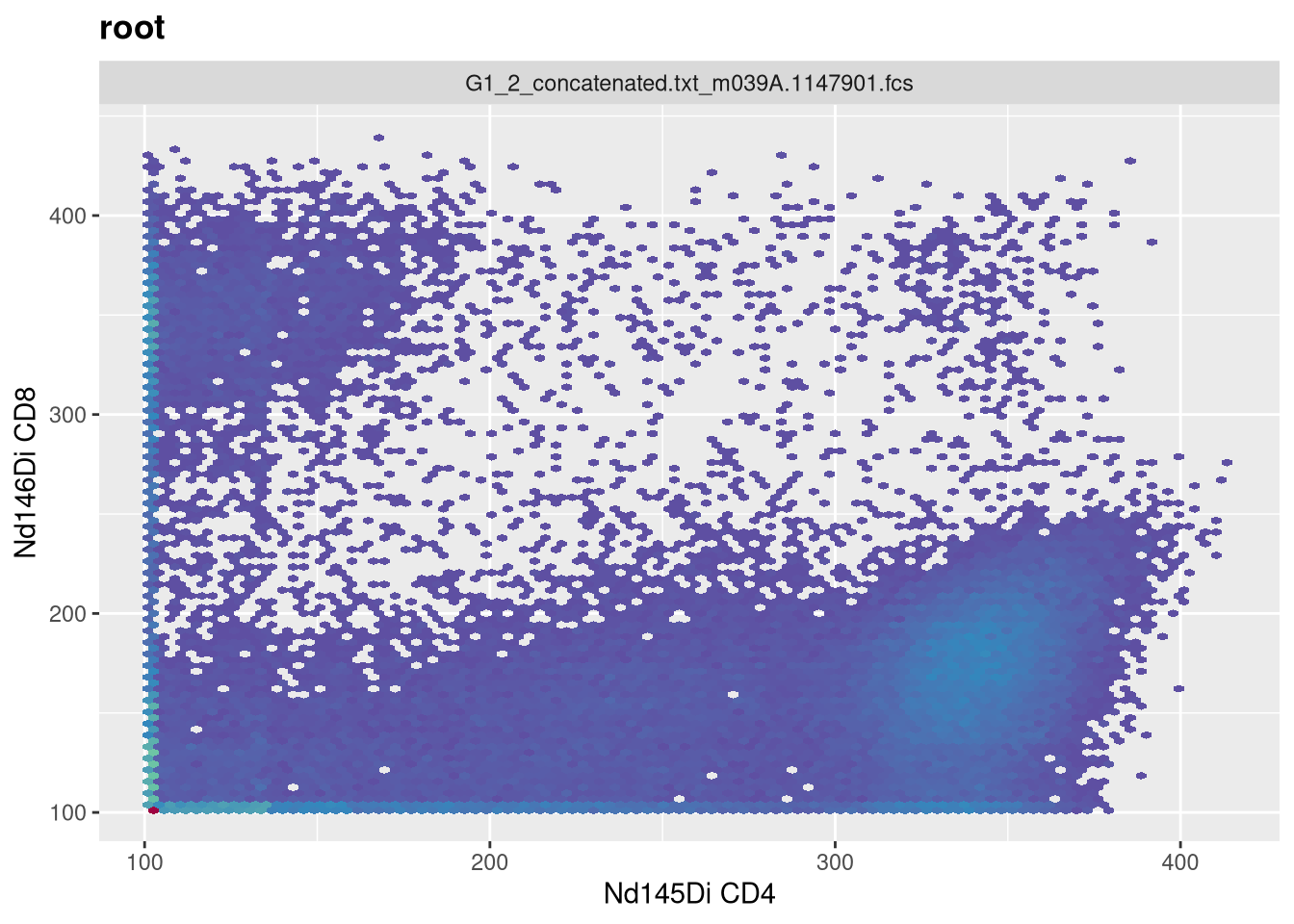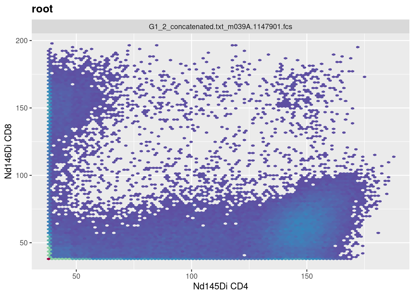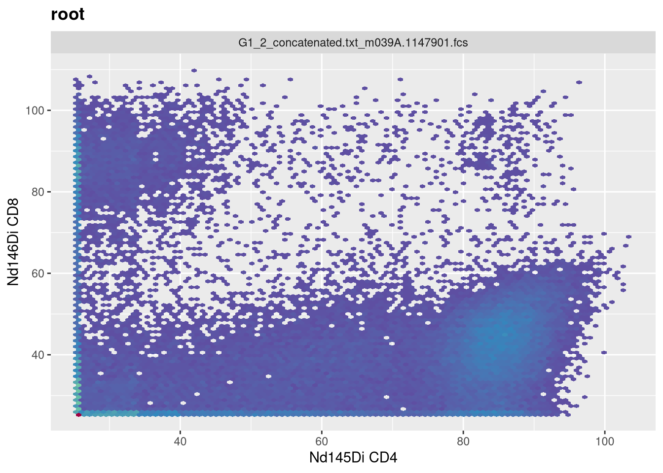 As cytometry instrument platforms will often vary on their range settings, the parameter argument values we used for this particular visualization may not be applicable to your own dataset, so you may need to tinker with your own .fcs files to ensure that you are visualizing the underlying data properly, depending on what you are doing (whether supervised manual analysis, or more unsupervised algorithmic style analysis).