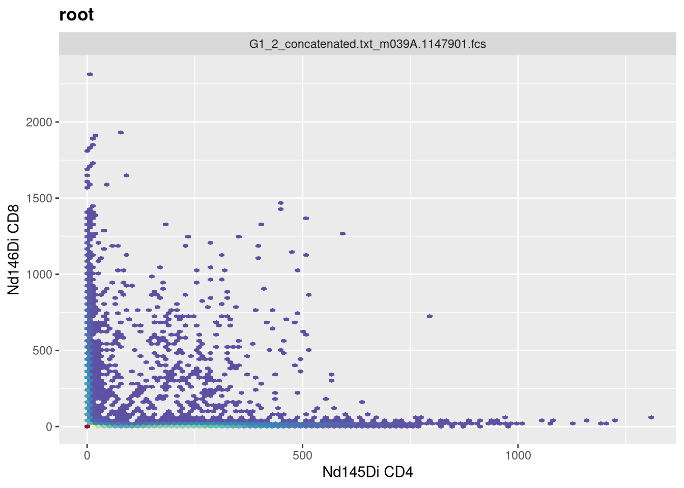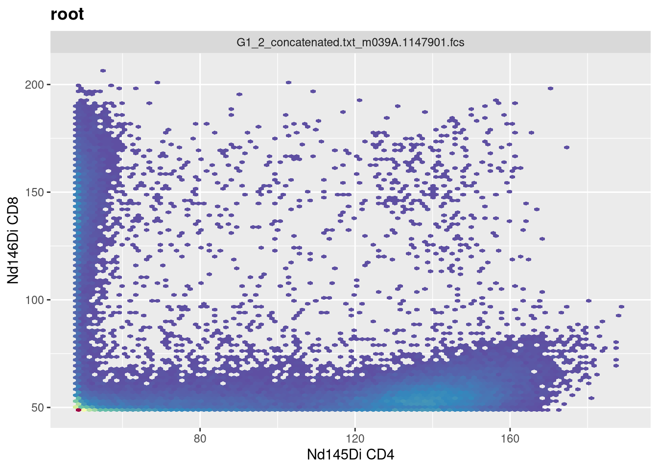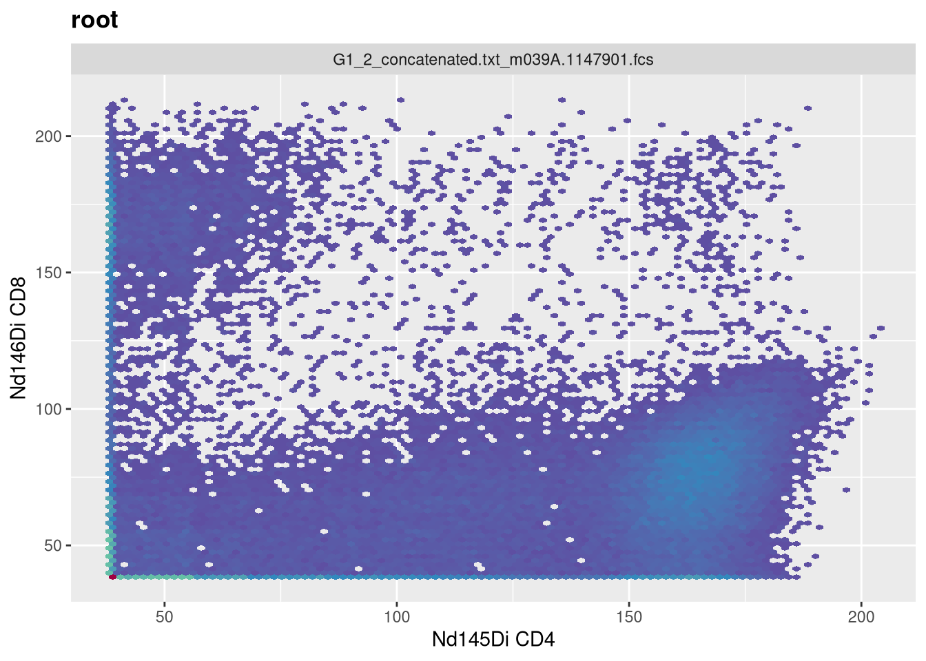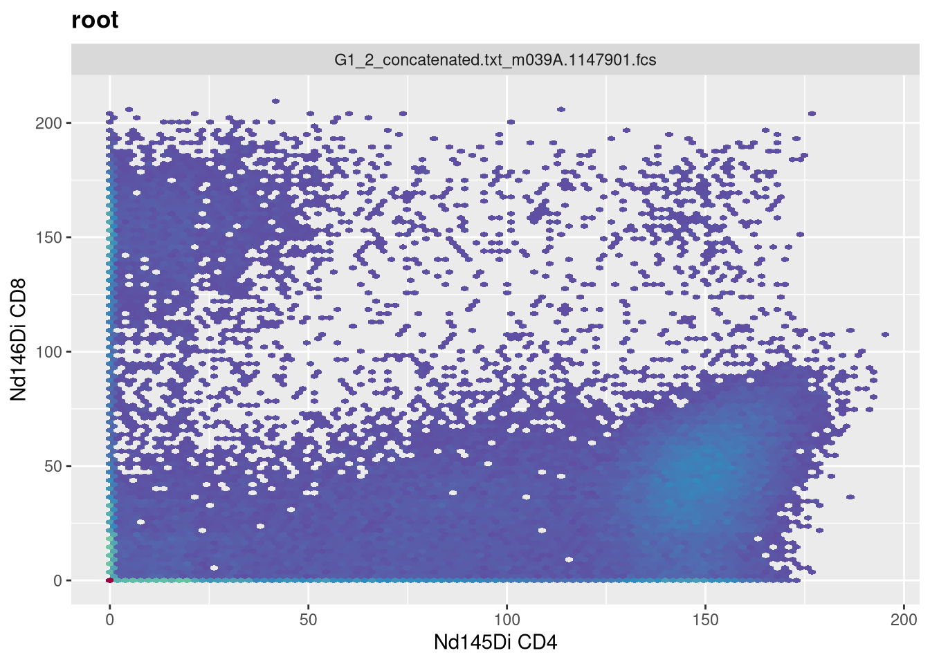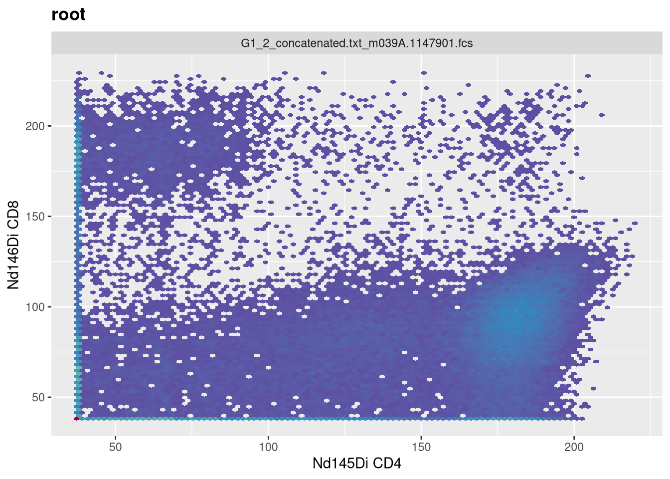 As cytometry instrument platforms will often vary on their range settings, the parameter argument values we used for this particular visualization may not be applicable to your own dataset, so you may need to tinker with your own .fcs files to ensure that you are visualizing the underlying data properly, depending on what you are doing (whether supervised manual analysis, or more unsupervised algorithmic style analysis).