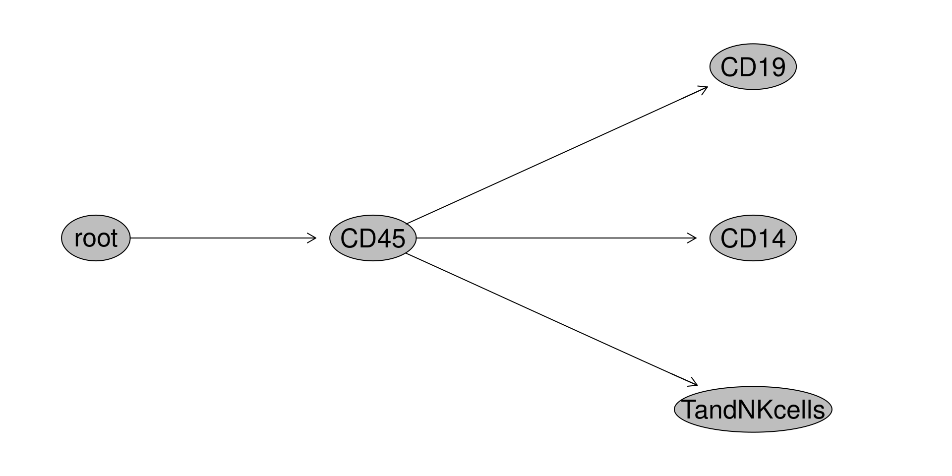 With that done, let’s add some gates to separate out CD45+ cells, and below those cells identify CD14+ (mainly monocytes), CD19+ (B cells), and CD14-CD19- (mostly T cells and NK cells for cord blood). My automated version uses openCyto with gate constraints to handle the variability, but for this example, lets reuse the flowGate approach using tribble function for quicker setup.