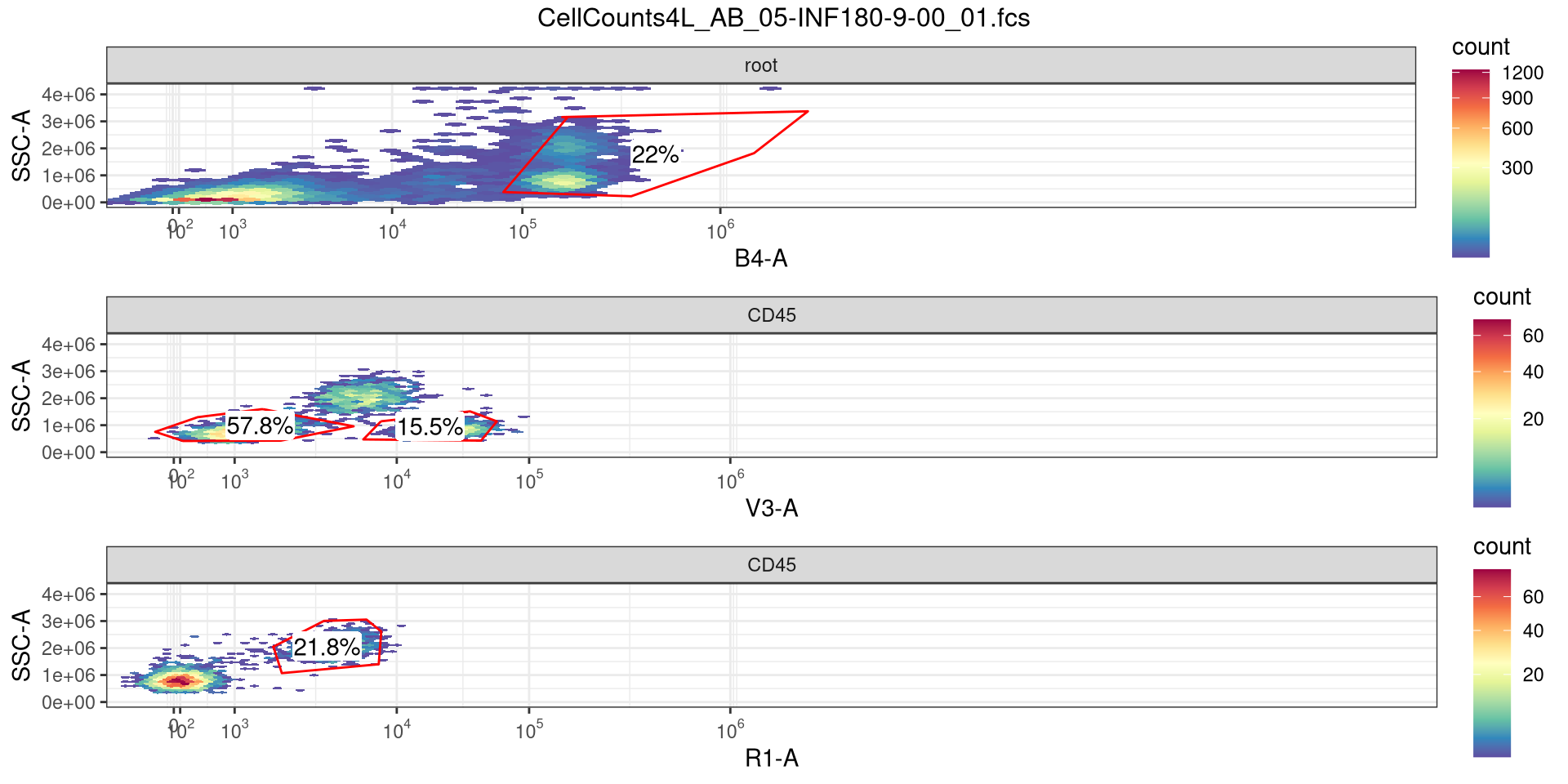 And we will need to apply gates (either through openCyto or flowGate), that would allow us to retrieve the counts for various cell populations we might be wanting to retrieve concentration info for.